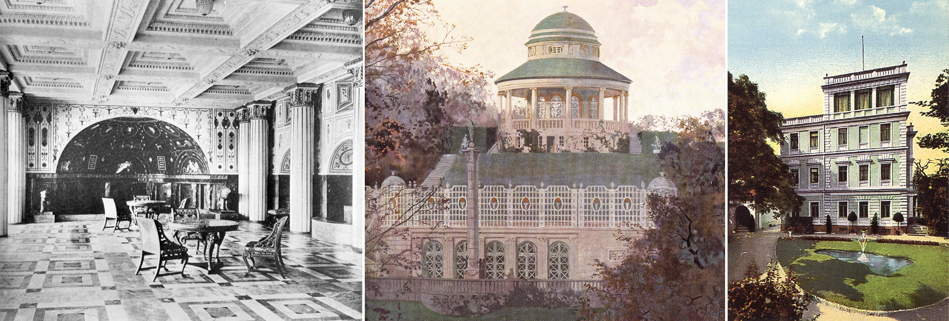 Der Marmorsaal mit seiner einzigartigen Architektur wurde für rein private Zwecke erbaut. Eigentlich wollten die Kinder des Industriellen und Antikenforschers Ernst Sieglin, der mit "Dr. Thomsons Waschpulver Marke Schwan" sein Vermögen verdiente, nur einen Tennisplatz. 1912 bis 1913 lies Sieglin das Teehaus, einen Tennisplatz und den Marmorsaal bauen. Die Zeitschrift "Kunst und Dekoration" kommentierte im Jahr 1914: "Grundlegend für die ganze Anlage war das Bedürfnis nach einem Tennisplatz und nach einer Gelegenheit, des Sommers im Garten den Tee zu nehmen und zugleich das Leben auf dem Spielplatz zu überblicken. Das gab den Gedanken ein, den entstehenden Raum unter dem Tennisplatze zu einem festlichen Gartensaale auszunutzen, und dieser wieder erforderte als Ausgang und Vorbereitung die vorgelegte Terrasse. Was so entstand, sei schlechthin "mustergültig in der Ausnützung des Terrains und in der Anschmiegung an die landschaftlichen Elemente", so der Autor des Artikels weiter.